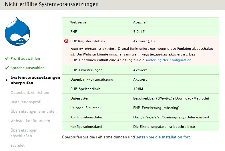 register_globals ist aktiviert. Drupal funktioniert nur, wenn diese Funktion abgeschaltet ist. Die Website könnte unsicher sein wenn register_globals aktiviert ist. Das PHP-Handbuch enthält eine Anleitung für die Änderung der Konfiguration.