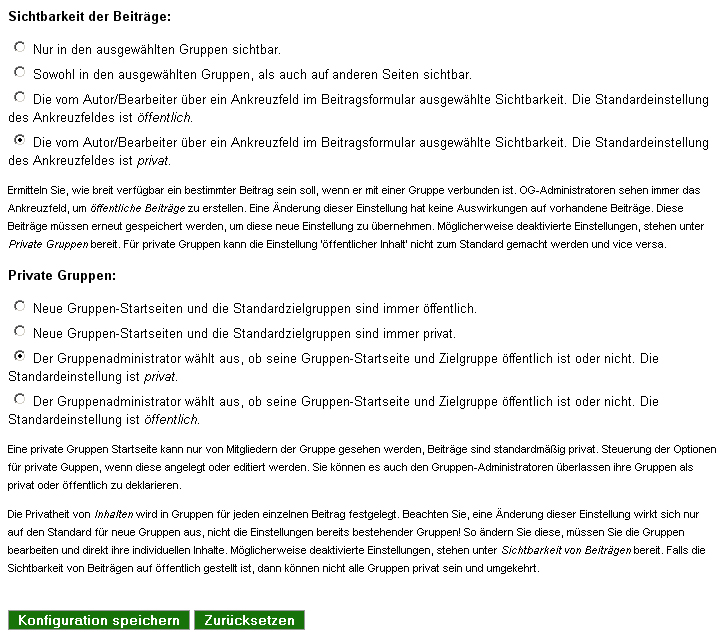 Der Gruppenadministrator wählt aus, ob seine Gruppen-Startseite und Zielgruppe öffentlich ist oder nicht. Die Standardeinstellung ist privat.