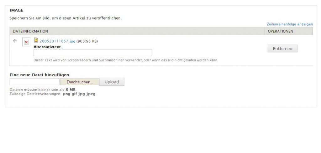 ich wollte nach dem Handbuch ein ganz normalen Artikel mit einem Bild dazu erstellen. Das Bild kann ich auch hochladen. Es erscheint aber kein Vorschaubild links neben dem Dateizeichen bzw. Dateinamen (siehe Bild). Auf der HP ist dann auch keine Vorschau, nur das rote X.