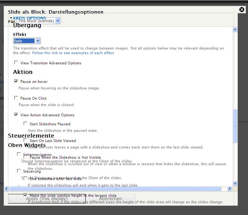 Darstellungsoptionen für Views slideshow, Anzeige der Auswahloption nicht korrekt