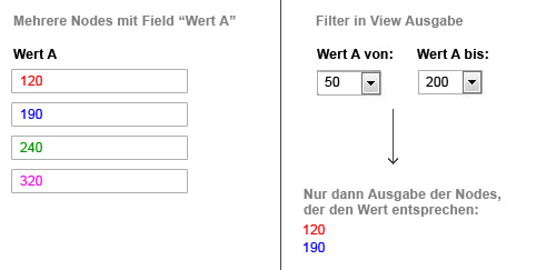 Stelle ich z.b. beim Bereich von 50 - 200 ein (2 seperate dropdownfelder), sollen nur die nodes aufgelistet werden, die im Field einen Wert in diesem Bereich haben, z.b. 120.