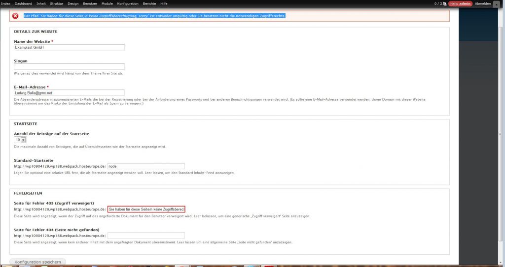 Ich bin als Admin eingeloggt und möchte individuelle Texte für die "Fehlerseiten" Meldung einrichten. Mit dem Abspeichern erscheint leider folgender Fehler: Siehe Anlage / Screenshot