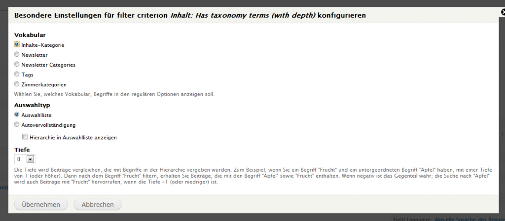 Der 1. Inhaltstyp benutzt keine Taxonomy. Der 2 Inhaltstyp benutzt eine Taxonomy. Für diese lasse ich nur Inhalte anzeigen, welche bestimmten Begriffen zugeordnet sind.
