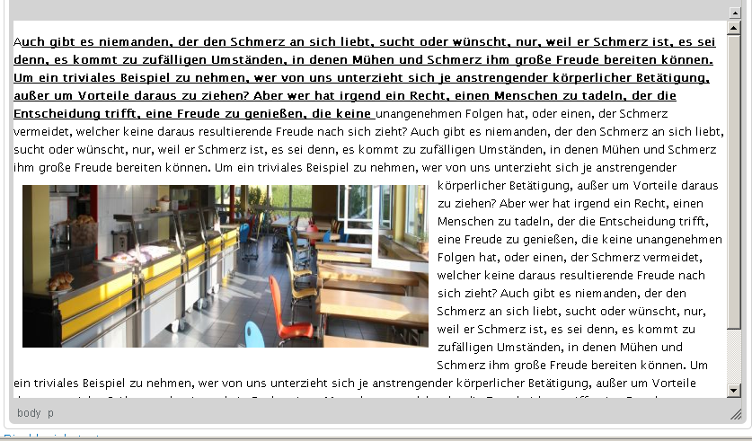 <p>A<u><strong>uch gibt es niemanden, der den Schmerz an sich liebt, sucht oder wünscht, nur, weil er Schmerz ist, es sei denn, es kommt zu zufälligen Umständen, in denen Mühen und Schmerz ihm große Freude bereiten können. Um ein triviales Beispiel zu nehmen, wer von uns unterzieht sich je anstrengender körperlicher Betätigung, außer um Vorteile daraus zu ziehen? Aber wer hat irgend ein Recht, einen Menschen zu tadeln, der die Entscheidung trifft, eine Freude zu genießen, die keine </strong></u></p><p> </p><p>unangenehmen Folgen hat, oder einen, der Schmerz vermeidet, welcher keine daraus resultierende Freude nach sich zieht? Auch gibt es niemanden, der den Schmerz an sich liebt, sucht oder wünscht, nur, weil er Schmerz ist, es sei denn, es kommt zu zufälligen Umständen, in denen Mühen und Schmerz ihm große Freude <img alt="" src="http://msgwiki.de/page/sites/default/files/field/image/nami.jpg" style="margin: 10px; width: 452px; height: 181px; float: left;" title="" />bereiten können. Um ein triviales Beispiel zu nehmen, wer von uns unterzieht sich je anstrengender körperlicher Betätigung, außer um Vorteile daraus zu ziehen? Aber wer hat irgend ein Recht, einen Menschen zu tadeln, der die Entscheidung trifft, eine Freude zu genießen, die keine unangenehmen Folgen hat, oder einen, der Schmerz vermeidet, welcher keine daraus resultierende Freude nach sich zieht? Auch gibt es niemanden, der den Schmerz an sich liebt, sucht oder wünscht, nur, weil er Schmerz ist, es sei denn, es kommt zu zufälligen Umständen, in denen Mühen und Schmerz ihm große Freude bereiten können. Um ein triviales Beispiel zu nehmen, wer von uns unterzieht sich je anstrengender körperlicher Betätigung, außer um Vorteile daraus zu ziehen? Aber wer hat irgend ein Recht, einen Menschen zu tadeln, der die Entscheidung trifft, eine Freude zu genießen, die keine unangenehmen Folgen hat, oder einen, der Schmerz vermeidet, welcher keine daraus resultierende Freude nach sich zieht? Auch gibt es niemanden, der den Schmerz an sich liebt, sucht oder wünscht, nur, weil er Schmerz ist, es sei denn,</p>Das ist , wenn ich unter Full html arbeiten würde. Wenn ich dann abspeichere, was ich eben getan habe, dann ist das Ergebnis so, wie ich das möchte...