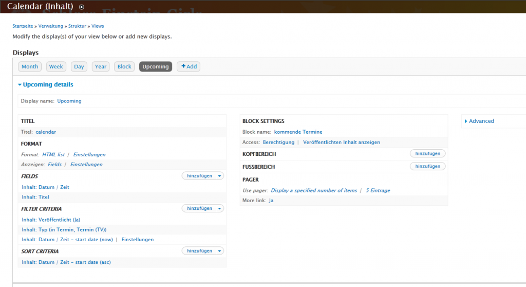 Hier mal die Einstellungen für meinen Upcoming-Block. Das Feld "Datum / Zeit" ist vom Typ "Date (ISO)", nur dann darf man die Uhrzeit bei einem Termin weglassen und einen Ganztagestermin daraus machen.