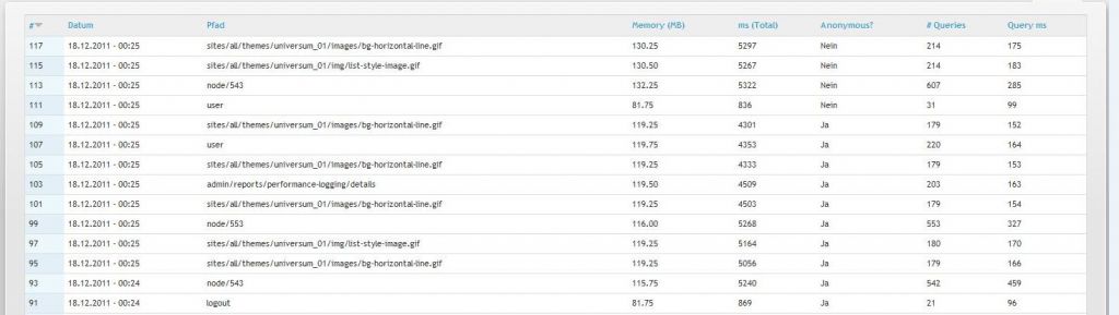 Als erstes habe ich mal das Modul Performance Logging aktiviert und mir dieses mal betrachtet. Dieses habe ich auch mal in den Anhang gepackt. Hier kann man deutlich die hohe Response Time von bis zu 6000 ms erkennen. Aber auch der Speicherverbrauch von gut 130MB macht mich sehr stutzig. Ist das denn für Drupal normal? Dies könnte für mich durchaus der Knackpunkt sein. Denn wenn das stimmt, würde bedeuten, dass bei jedem Seitenaufruf ca. 3x 130MB vom Datenbankserver zu dem Apache Node übertragen werden müssen. Diese sind zwar über 1Gbit miteinander verbunden aber wenn wir im Durchschnitt von ca 70MB/s ausgehen, dann würde das auch durchaus mit 5 bis 6 Sekunden hinkommen.