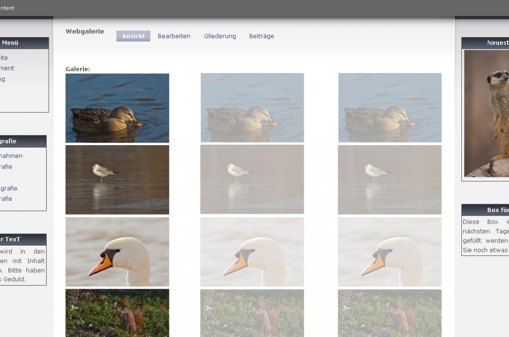 Ich habe nun ein paar Bilder hochgeladen, leider werden diese alle untereinander gestapelt. Ich hätte es aber gern so, dass 3 Thumbs nebeneinander angezeigt werden. Ich habe dazu noch mal einen Screenshot gemacht und meinen Wunsch (40% transparent) eingefügt. So wie es auf dem Bild aussieht, hätte ich es auch gern auf meiner Webseite. Ist dies machbar und evtl. durch einen nicht Drupal-Profi realisierbar?