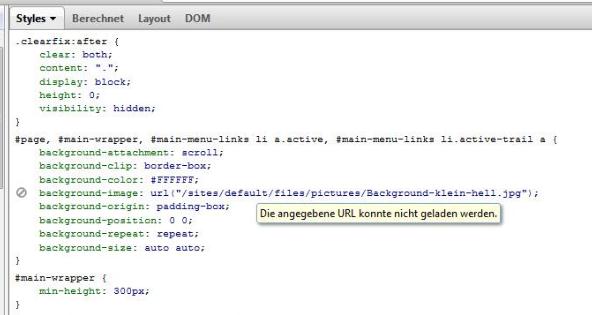 background-image: url("/sites/default/files/pictures/Fast-article-writing.jpg");Firebug versucht nun das Bild zu laden. Wird das neue Hintergrundbild neben dem Mauszeiger angezeigt, ist das Bild korrekt eingebunden und der Fehler muss woanders in der CSS-Datei gesucht werden.