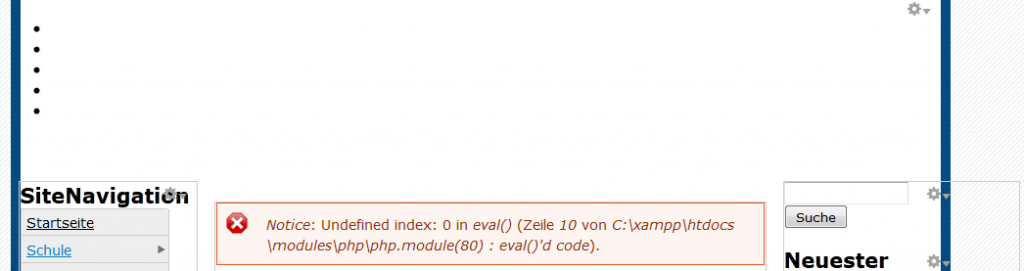 Leider hat sich jetzt in der Region Slider, der ich den Block Slides zugewiesen habe, nicht die erhoffte Bilderreihe gezeigt, sondern es werden kryptische Zeichenfolgen (siehe Attachments) angezeigt. Unter anderem ist eine PHP Notice zu sehen (Attachment Fehler3.png). Ich verwende Xampp 1.7.7, eventuell liegt es an dem.