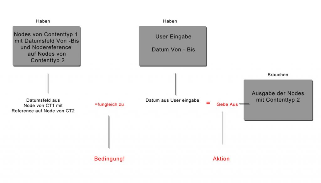 Node 1 von Contenttyp A wird ausgegeben wenn Datum von Node 2, 3 und 4 von Contenttyp B (alle referenciert auf A) ungleich && nicht zwischen dem Datum von der User eingabe liegt. (siehe Bild)
