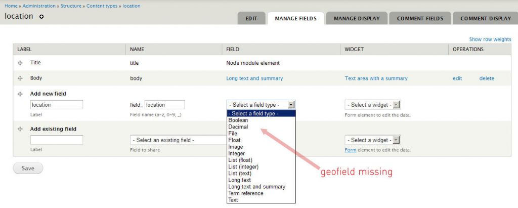 An der Stelle "Select a field type" sollte nun eigentlich "geofield" zur Auwahl stehen,