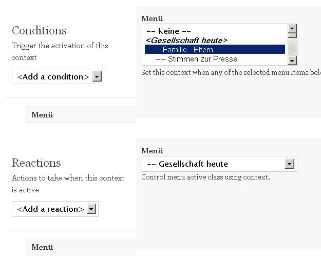 In den Conditions habe ich gewählt: "Menü" und kann nur einen Menüpunkt markieren: Ich habe (jetzt einmal nur um die Reaktionen zu testen) den ersten des Submenüs "Gesellschaft heute" gewählt. (siehe kontext_1.jpg im Anhang).