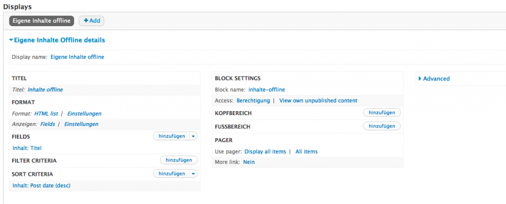 Du definierst einen Contextual-Filter (oder ein Argument nach alter Sprachregelung) und zwar Inhalt: AutorID. dabei wird eigentlich erwartet, daß das Argument in der URL zur Verfügung steht, was Du aber nicht hast. Also mußt Du, in der Abteilung "Was tun, wenn kein Argument zur Verfügung steht" ein "Default Argument" bereit stellen, nämlich die UID des angemeldeten Benutzers (läßt sich auswählen). Damit werden alle Beiträge gezeigt, bei denen der angemeldete Benutzer der Autor ist.