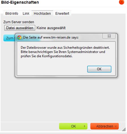 habe den CKEditor installiert, funktioniert soweit auch alles. Wenn ich dann versuche über das Menü des CKEditor ein Bild auf den Server zu laden, kommt immer eine Fehlermeldung.
