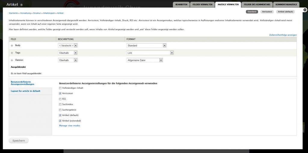 2. unter admin/structure/types/manage/page/display (zum Beispiel) mindestens einen Eintrag bei "custom display settings" setzen