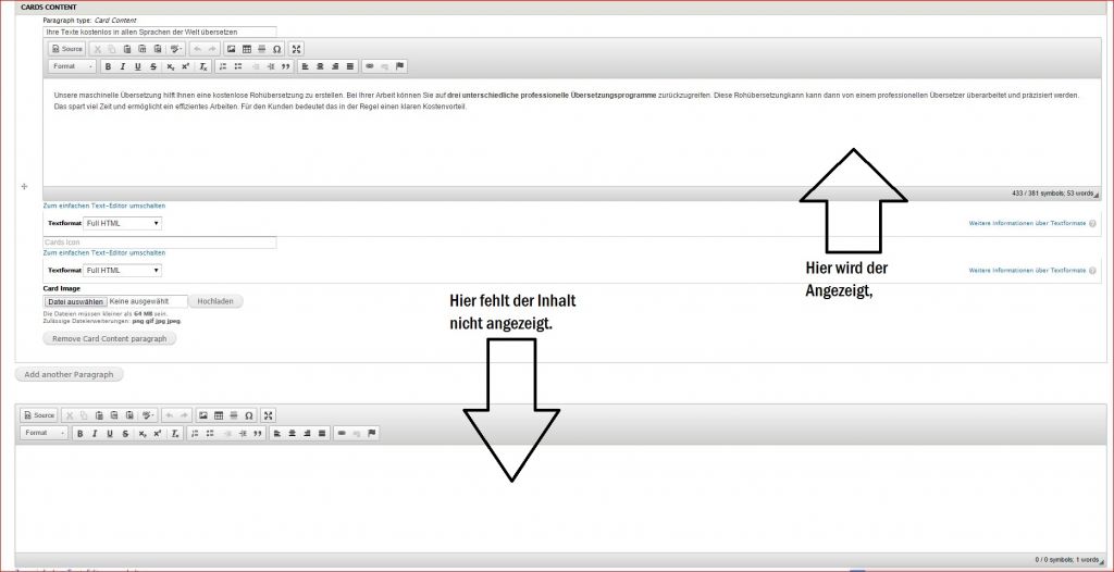 Ich habe auf meiner Startseite mehrere Artikel und bei "Struktur->Inhaltstypen->Artikel->Bearbeiten->Anzeige verwalten-> Anrisstext-> Body Format" auf Zusammenfassung oder getrimmt.