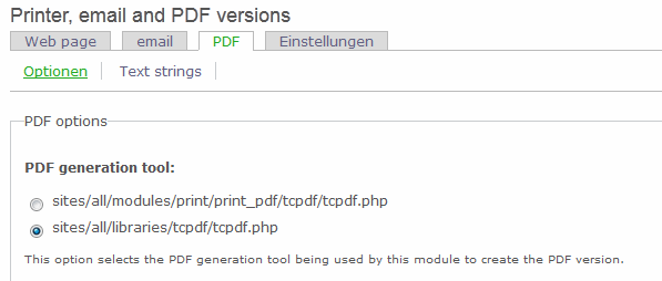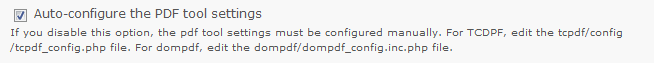 Ferner kann man in den Einstellungen zum o.g. Modul die Option "Auto-configure the PDF tool settings" auswählen. Wenn man dies nicht tut, kann es erforderlich sein, tcphp manuell zu konfigurieren (tcpdf_config.php).