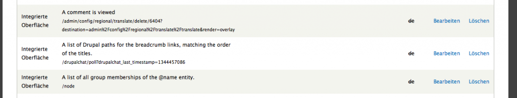 Ich verwende u.A. l10n_update. Leider mag mein Kunde nicht warten und möchte das Fronten schnellstmöglich mehrsprachig haben. Da ich viele Module verwende (u.A. OG, Privatemsg und die üblichen Verdächtigen) habe ich ziemlich viele unübersetzte Strings aus dem Backend. Momentan sind noch knapp 2000 Strings nicht übersetzt, davon schätze ich mal sind 10% Frontend. Die manuell zu suchen ist mir zu zeitaufwändig. Darum möchte ich die Strings die "/admin..." enthalten (siehe Anhang) löschen. Geht händisch problemlos, dauert aber zu lange. Darum suche ich den entsprechenden DB-Eintrag.
