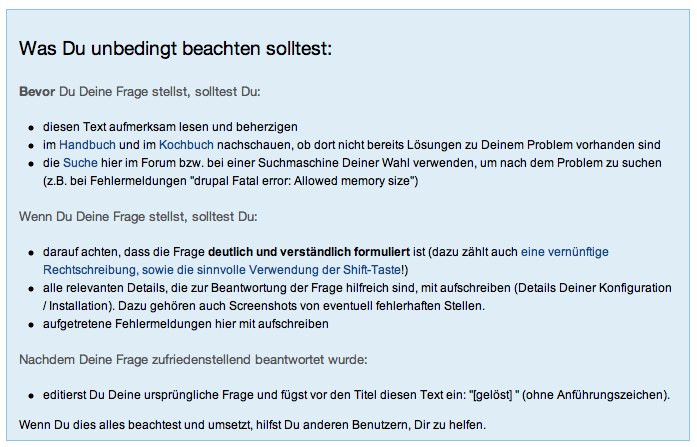 Ach ja, hier noch ein Screenshot der Hinweise, die jedem Benutzer beim Erstellen eines Forenthemas angezeigt werden. An diese sollte man sich halten, wenn man Hilfe erwartet. Nur für den Fall, dass Du das "übersehen" hast.