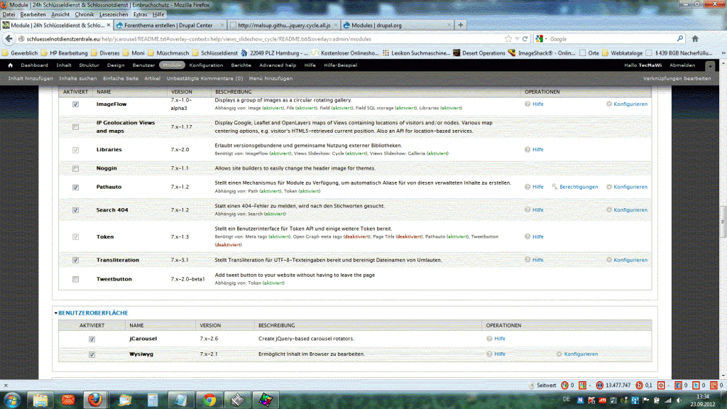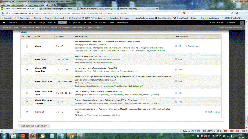Ihr müsst im Verzeichnis "/sites/all/libraries" noch die angehängten JQuery-Erweiterung "jquery.cycle" und angeblich auch "jquery.carousel" einfügen. Dann klappt das auch mit dem Nachbarn, äh mit der Slideshow. Ich musste feststellen, dass es mit dem carousel-plugin beim löschen von meiner Festplatte Probleme gibt. Ich werde gliech mal versuchen den Ordner im abgesicherten Modus zu entfernen. Ist also nicht auszuschließen, dass das die Erweiterungen nicht sauber sind.