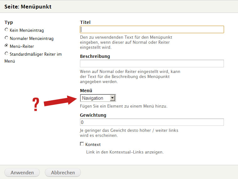 Dabei muss ein Menü ausgesucht werden, dem der Reiter zugeordnet werden soll.