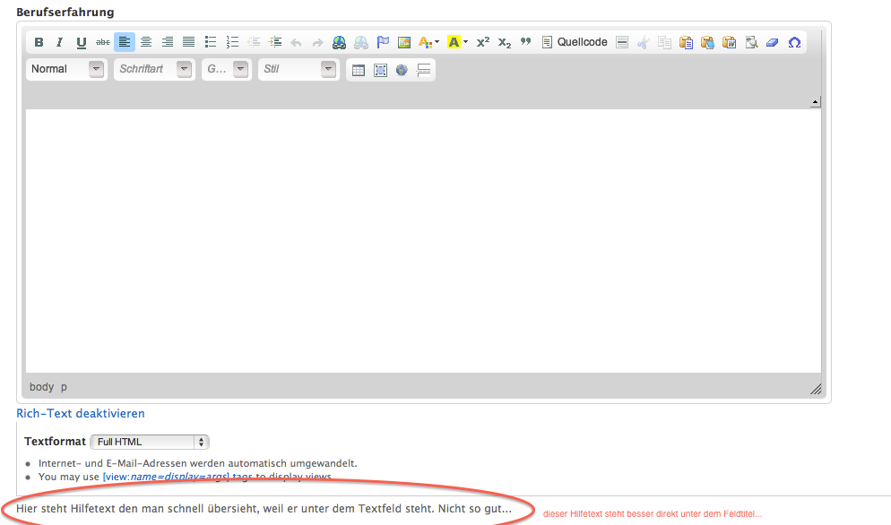 Position des Hilfetextes zu einem Feld in Inhaltstyp ändern