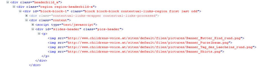 Das Ergebnis ist, dass die Bilder untereinander aufgereiht werden und keine Animation erfolgt. Auch im FireBug sieht man zwar den js-Code, aber kein Spur einer js-Aktion. Im HEAD-Bereich ist das cycle-script eingefügt <script src="http://www.childrens-voice.at/sites/all/themes/theme-name/js/jquery.cycle.lite.js?mcmb2t" type="text/javascript">.