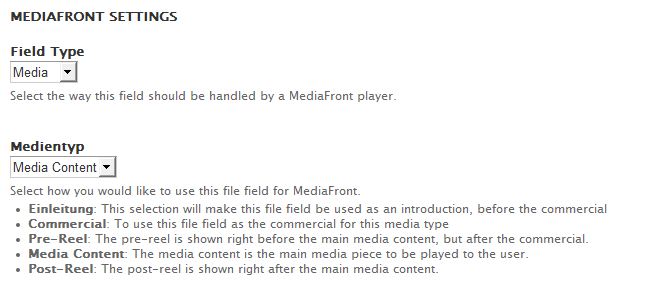 Bei den Einstellungen zum Feld habe ich „Field Type: Media“ und „Medientyp: Media Content“ gewählt.