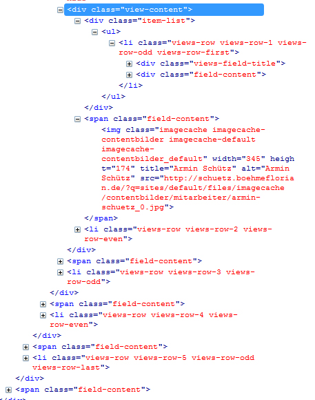 Beim Darstellungs-Style eines Views als HTML-List sollten normalerweise alle Felder eines Beitrags in einem Listenelement dargestellt werden. Darin sollten sich in meinem Fall Titel, Textkörper und ein Imagefield befinden. Ich weiß nicht wieso, aber die ganzen Inhalte werden ganz komisch dargestellt, auch falsch verschachtelt. Den Titel und Textkörper packt er in das Listenelement, das Imagefield jedoch außerhalb davon in ein DIV mit der Klasse "field-content". Und das durch alle die Beiträge, die das View ausgibt. Ich könnte zwar das ganze noch im Row-Style "Beitrag" darstellen, erziele dann aber nicht das Ergebnis was ich möchte.