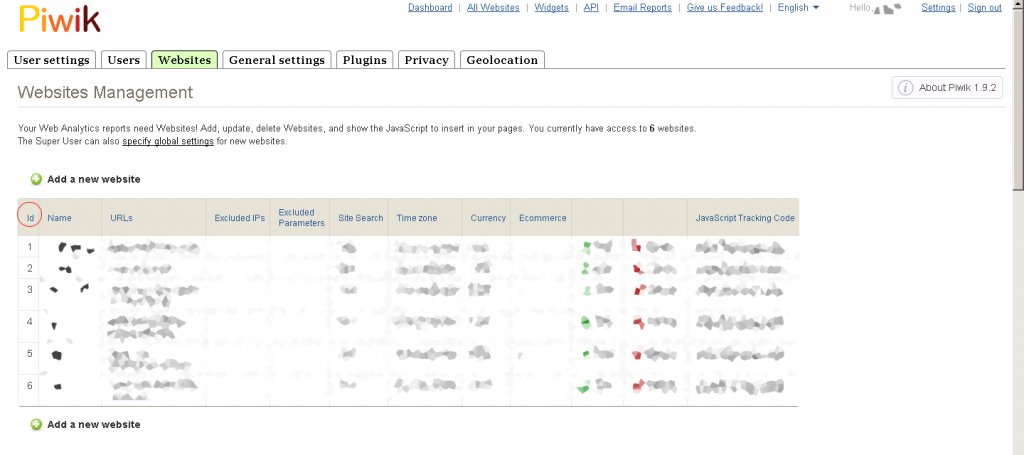 Unter der angegebenen Location (Settings link, then the Sites tab) meines Piwik-Accounts finde ich leider keine. Auf allen anderen Seiten auch nicht.