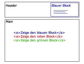 Beispiel: Der Benutzer kommt auf die Seite. Hier sieht er drei Links, welche beschreiben, dass beim Klick sich der Block im Headerbereich ändert. Er entscheidet sich für einen Link und dieser ersetzt den aktuell angezeigten Block und behält den ausgewählten während des ganzen surfens auf der Seite bei.