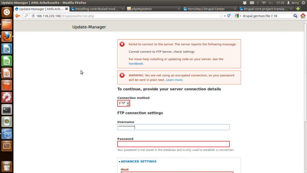 doch dann kommt eine Seite "Update Manager" der meine FTP Daten haben will. Sowohl wenn ich über Teamviewer zugreife als auch wenn ich es von meinem Rechner aus installieren will (auf die Seite kann ich durch einen Internetbrowser ja zugreifen). (im anhang ein Screenshot der Fehlermeldung)
