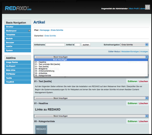 Anbei ein Screenshot von der Contenterstellungsoberfläche vom Contenttyp Artikel innerhalb von Redaxo. So Flexibel !