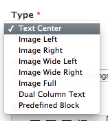 Da kommt dann ein Dropdown Feld Optionen mit Optionen wie »Text«, »Dual Text«, »Image Left«.