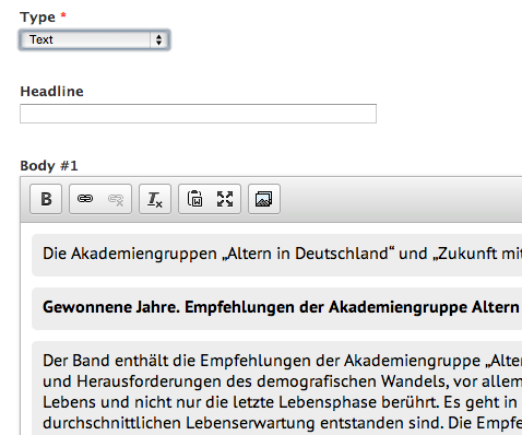 Ich habe lange nach einer guten Lösung gesucht, die die Pflege von Standard-Seiten für Redakteure angenehm macht. Insbesondere das zusammenstellen diverser Inhaltselemente auf einer Seite (Text, Bild, Tabelle, Galerie...). Das Erstellen mehrerer Nodes auf Basis von Inhaltstypen, die dann auf einer Seite zusammengestellt werden ist für technisch nicht so versierte Redakteure schwer zu verstehen.