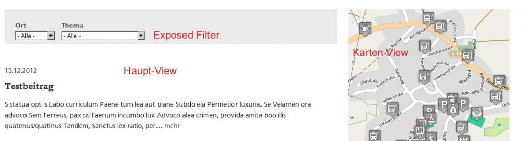 Für die Ausgabe habe ich eine Haupt-View mit Exposed Filter erstellt, die Artikel nach Ort & Thema filtert.