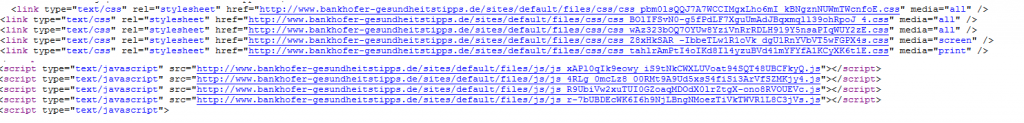 Ja, das ist mir klar. So habe ich das auch gemacht. Nur erscheint im Quelltext der Inhalt der CSS- und Javascript-Dateien und nicht der externe Aufruf.Das ist das Problem.