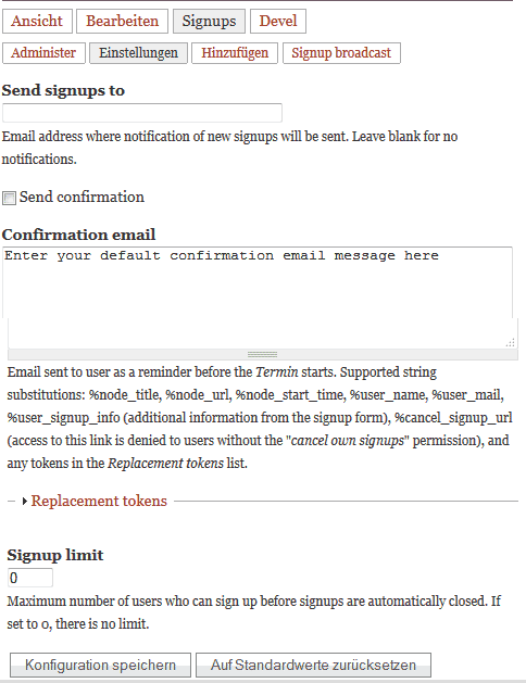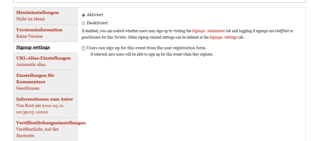 In der Node kommt ein Tab "Signups" hinzu (Anhang 2)