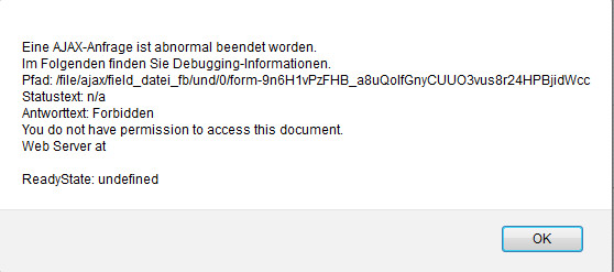 Ich habe seit einiger Zeit das Problem, dass wenn ich eine Datei über den Upload Button hochladen möchte eine AJAX Meldung auftaucht mit der Begründung ich hätte keine Rechte trotz Administratoren Rechte über Drupal. Ein Bild von der Meldung habe ich im Anhang hochgeladen.