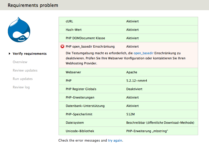 Die Testumgebung macht es erforderlich, die open_basedir Einschränkung zu deaktivieren. Prüfen Sie Ihre Webserver Konfiguration oder kontaktieren Sie Ihren Webhosting Provider.Ich vermute, dass ich iwo eine Pfad Einstellung übersehen hab.