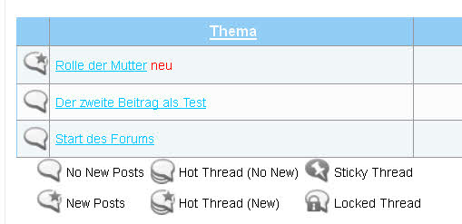 Unter der Anzeige der Beiträge zu einem Forum-Thema erscheinen 6 Symbol-Anzeigen: No New Posts, New Posts, Hot Thread (No New), Hot Thread (New), Sticky Thread und Locked Thread. (siehe Anhang).