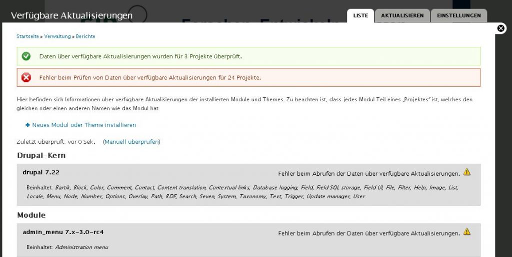 Anbei habe ich ein Foto mit gepostet, wo die meldung mir angezeigt wird, dass bei manuell überprüfung nur wenige module geprüft wurden und wenn ich dann noch einmal eine manuelle überprüfung starte, dann konnte zu keinem modul ein update gefunden werden.