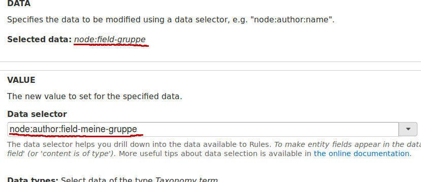 Wichtig ist hier, nur die Felder ohne Parameter auszuwählen. Beispiel: Mein zu beschreibendes Taxonomy Feld im Inhaltstyp hat den Namen field_gruppe. Das Taxonomy Feld, welches den Wert liefern soll, heißt field_meine_gruppe und kommt aus dem normalen Userprofil. Ich muss also 1. node:field_gruppe benutzen und nicht node:field_gruppe:irgendwas und 2. node:author:field-meine-gruppe und nicht node:author:field-meine-gruppe:irgendwas