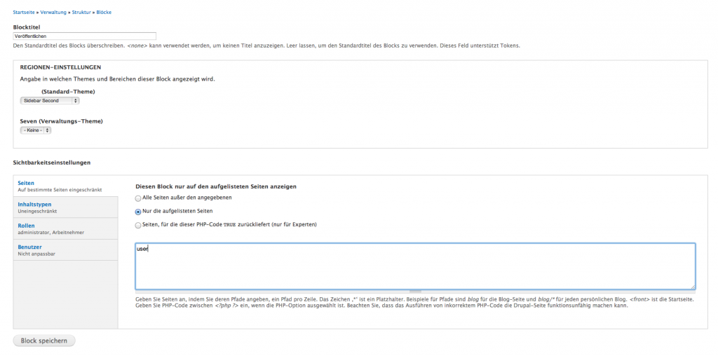 Wie ich block unter user/*/edit anzeige weiss ich aber wie nur auf user anzeigen?