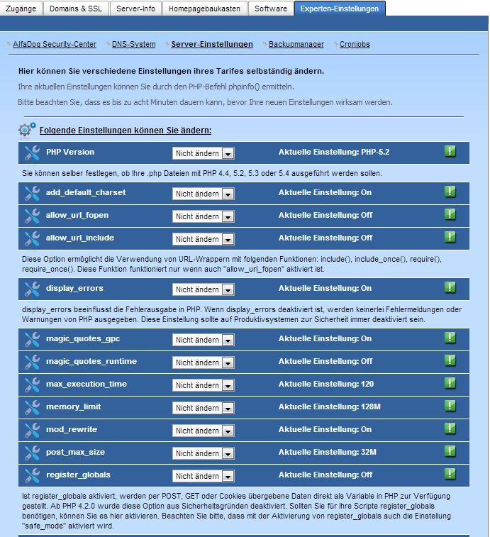 Kann das sein, dass dies mit der PHPversion was zu tun hat? Da ist momentan 5.2 installiert. Kann ich das gefahrlos einfach einfach auf 5.4 umstellen?