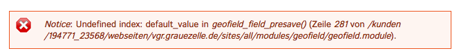 Das neue Problem bezieht sich jetzt auf das Geofield-Feld. Folgender Fehler erscheint nach dem Erstellen eines neuen Standortes.