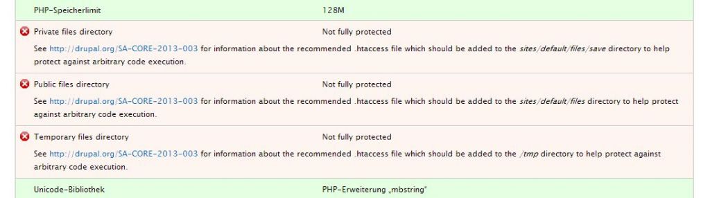 Doch wenn ich den Statusbericht von Drupal aufrufe, bekomme ich drei Fehlermeldungen. Wer kann mir helfen, denn mir scheint ich stehe auf dem Schlauch oder kapiere es einfach nicht.