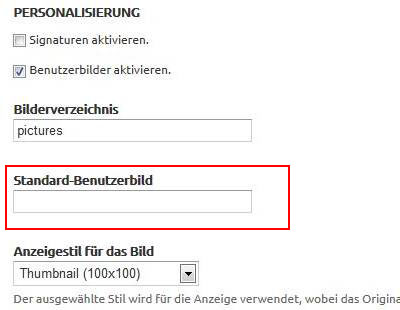 Ja, ich meinte dort die Stelle, wo der Pfad zu einem Standard-Benutzerbild eingetragen werden kann. Wenn da nichts drin ist, könnte es über das Template geregelt sein oder durch ein Modul, das ich nicht kenne. Hast du die Seite von einem anderen Entwickler übernommen?