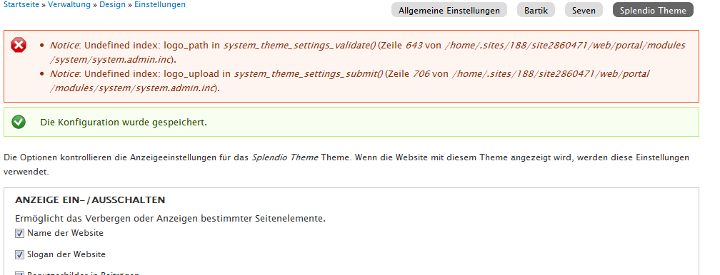 Problem2: Wenn ich als admin unter Design - Einstellungen auf "speichern" gehe, bekomme ich eine Fehlermeldung wie in screenshot 2, egal ob ich was ändere oder nicht, favicon, Titel etc. wird alles angezeigt.
