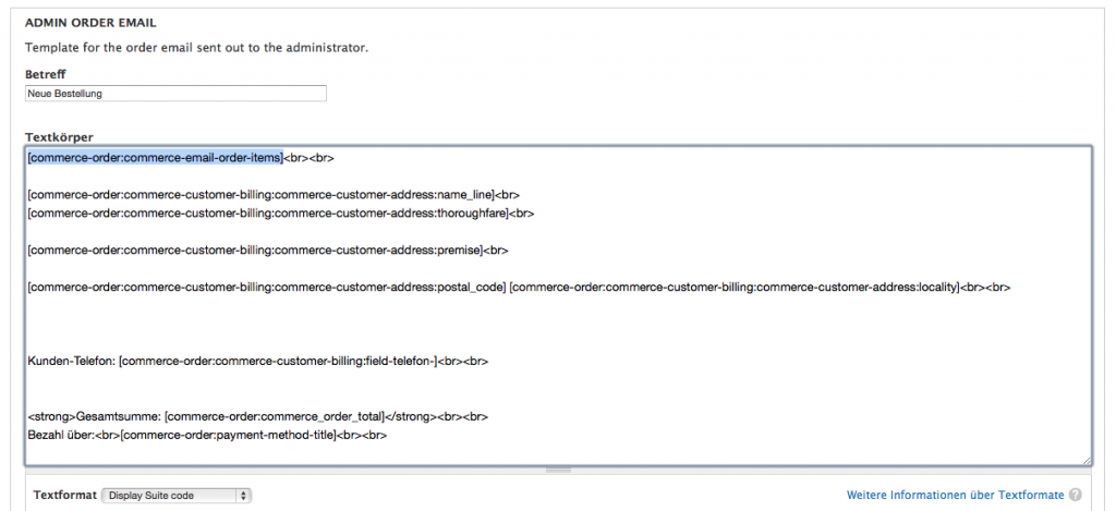 Wenn ich nun im Admin Bereich auf der Seite bin, wo ich diesen Text bearbeiten kann, bekomme ich verschiedene Ersetzungsmuster/Token (z.B. [commerce-order:order-id]) angezeigt. Leider finde ich dort nicht alle dieser "Befehle", die ich für die Erstellung meines Bestellformulars benötige. Weiter wie das hier bin ich leider nicht gekommen: